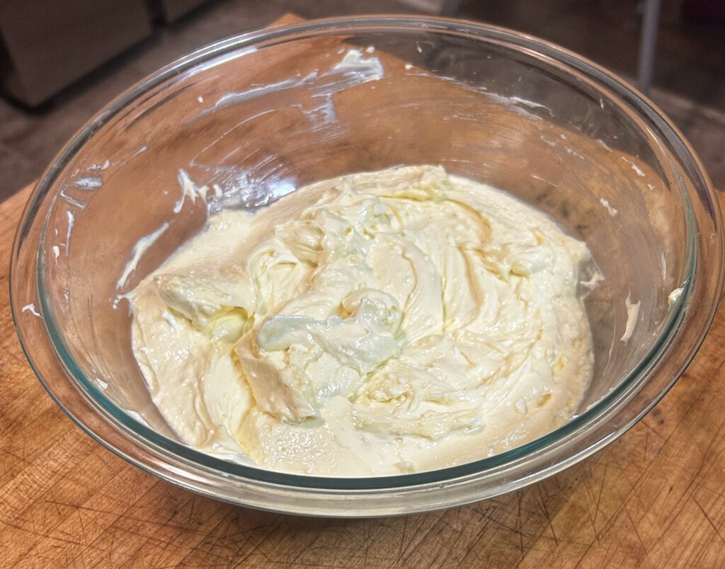 Use a hand mixer or stand mixer to mix together softened cream cheese, sugar, eggs, vanilla extract and almond extract.