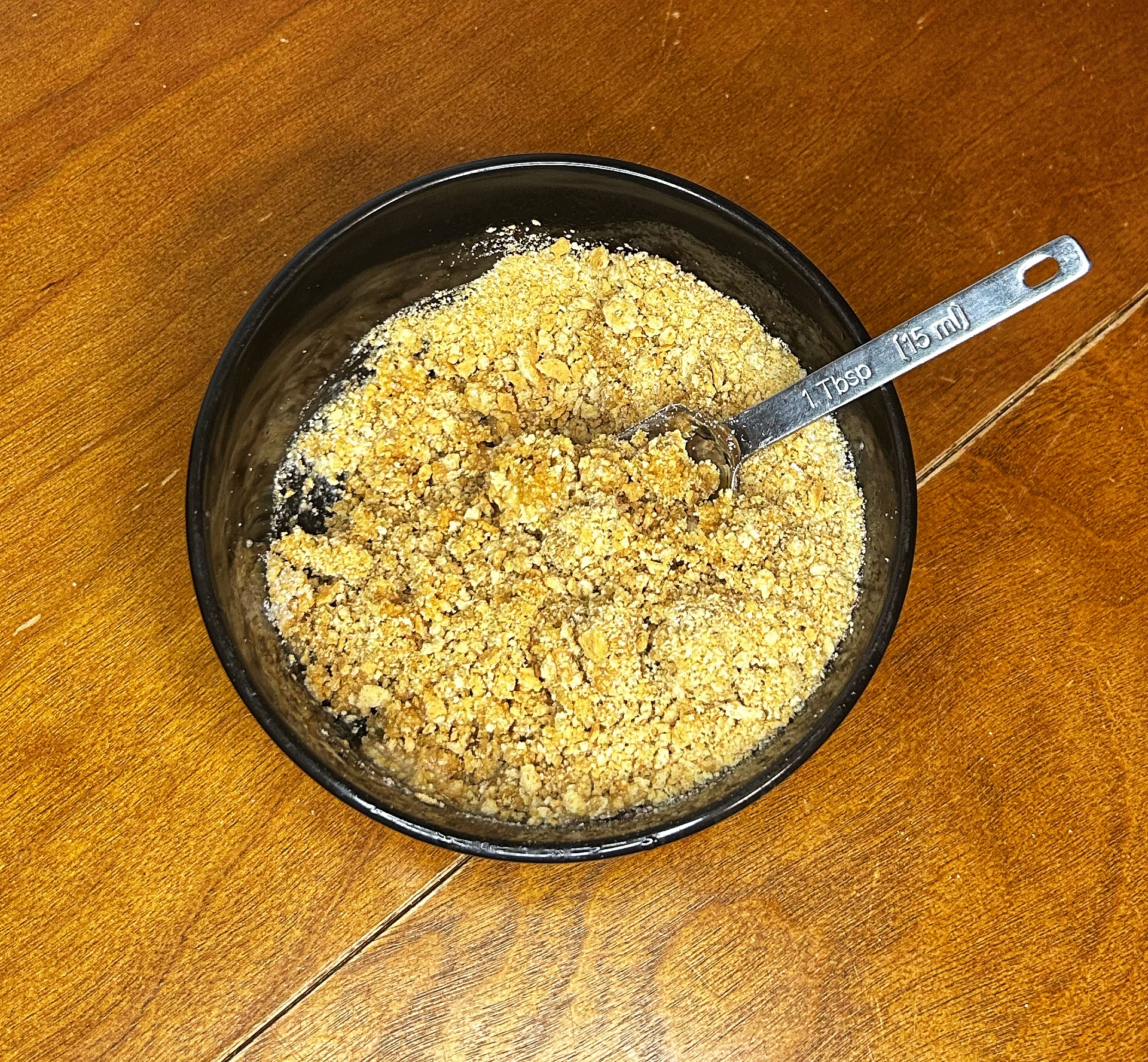 Step 3: Mix graham cracker crumbs, sugar, melted butter and flour in a medium bowl.