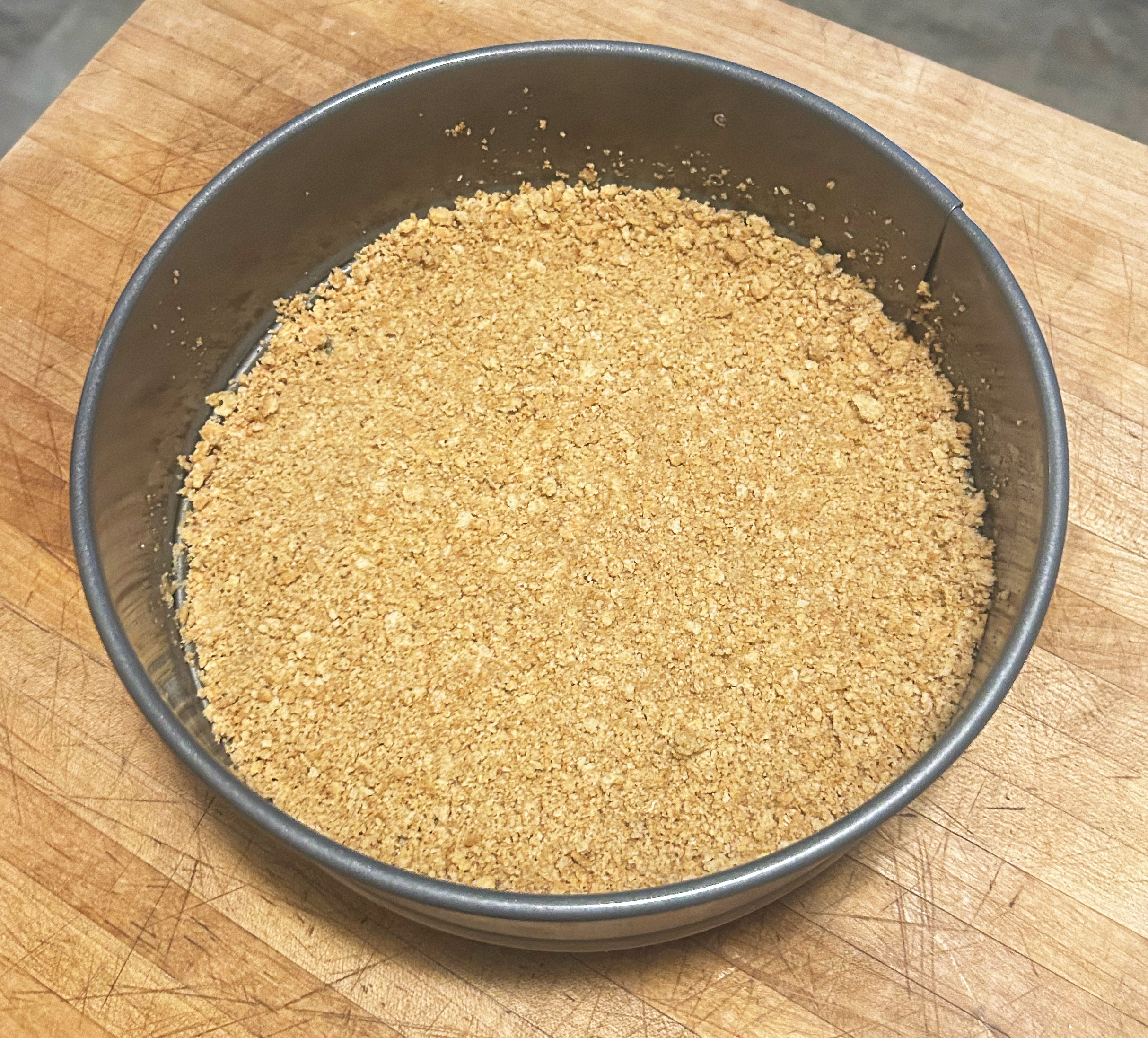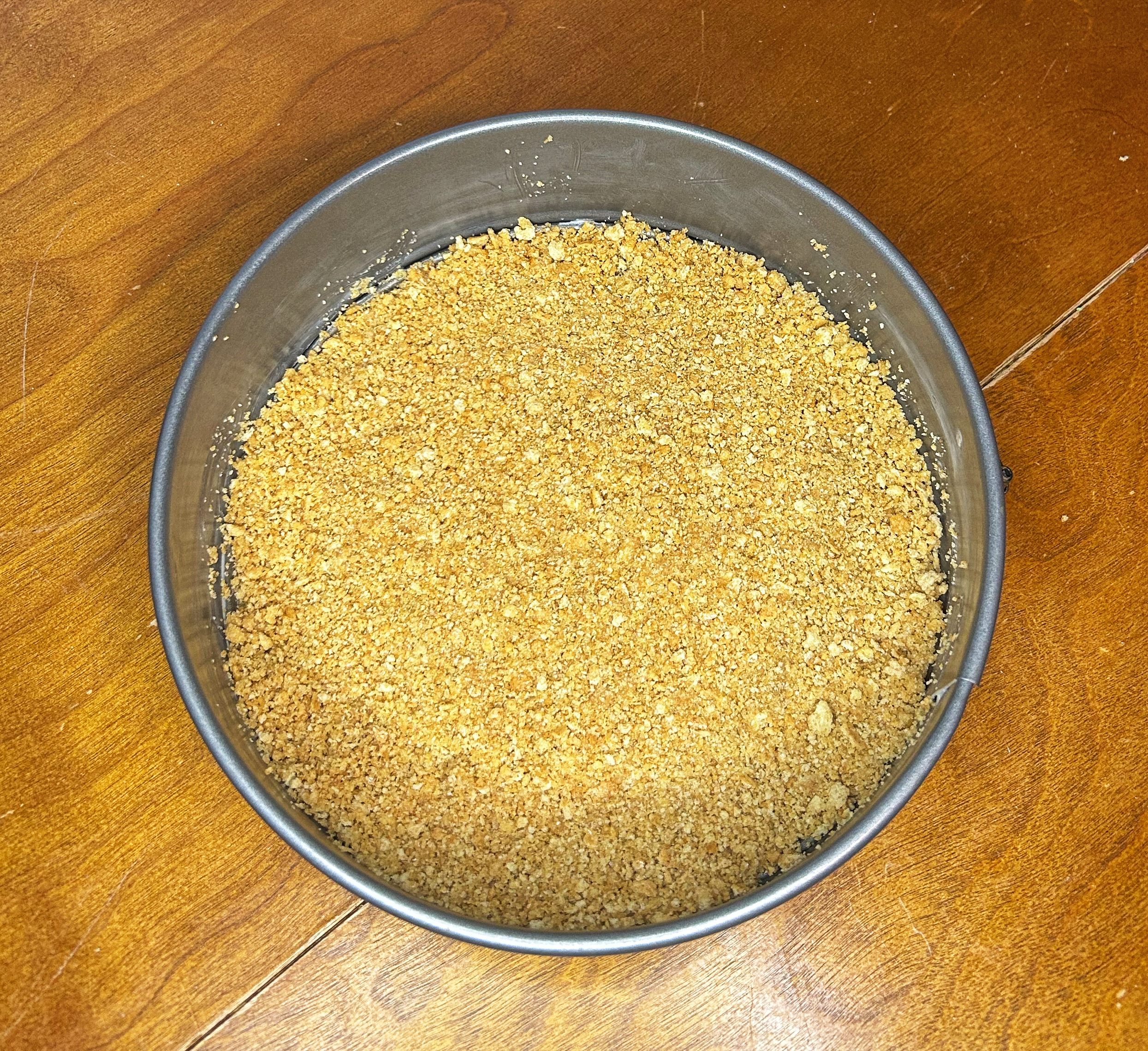 Take 7 sheets of graham crackers and put them in a Ziploc bag. Roll with a rolling pin to crush into fine crumbs. Melt the butter.