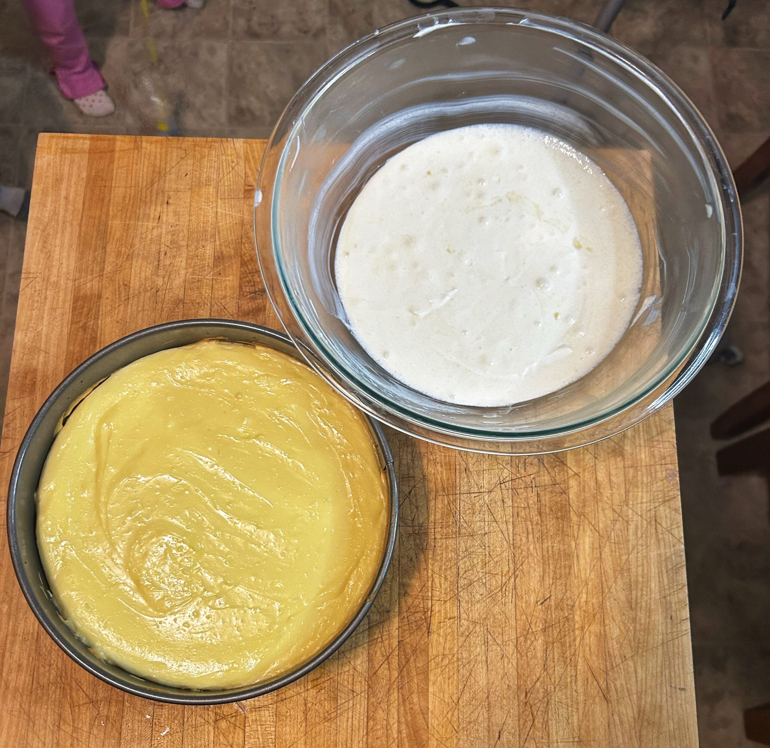 Step 10: Pour mixture over hot cake. Bake an additional 12 minutes. The mixture will be jiggly but solidify as it cools.