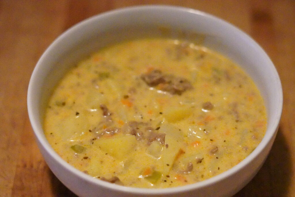 This cheeseburger soup is creamy and flavorful. Packed full of potatoes, vegetables, and ground beef, this soup will fill you up and have you feeling satisfied. It is the perfect week night meal and the ultimate comfort food.