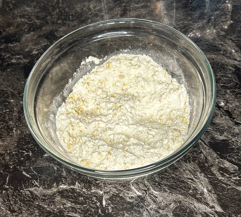 Step 2: Lightly spoon flour into dry measuring cups; level with a knife. Combine flour, sugar, baking powder, baking soda, sea salt and cinnamon and stir well with a whisk. Stir in oats.
