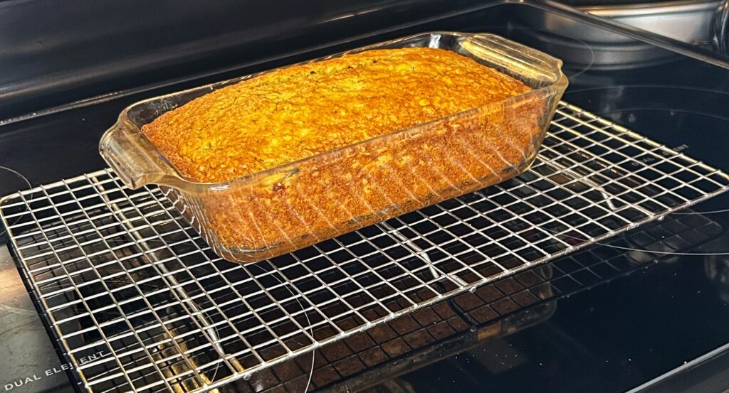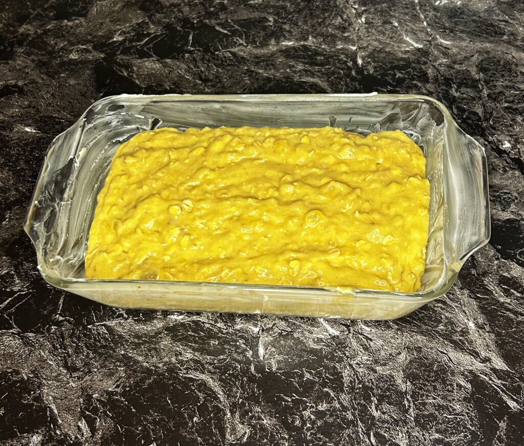 Step 4: Spoon batter into a greased 8×4 or 9×5-inch loaf pan. Bake at 350 degrees for 55 minutes or until a wooded toothpick inserted into the middle comes out clean.