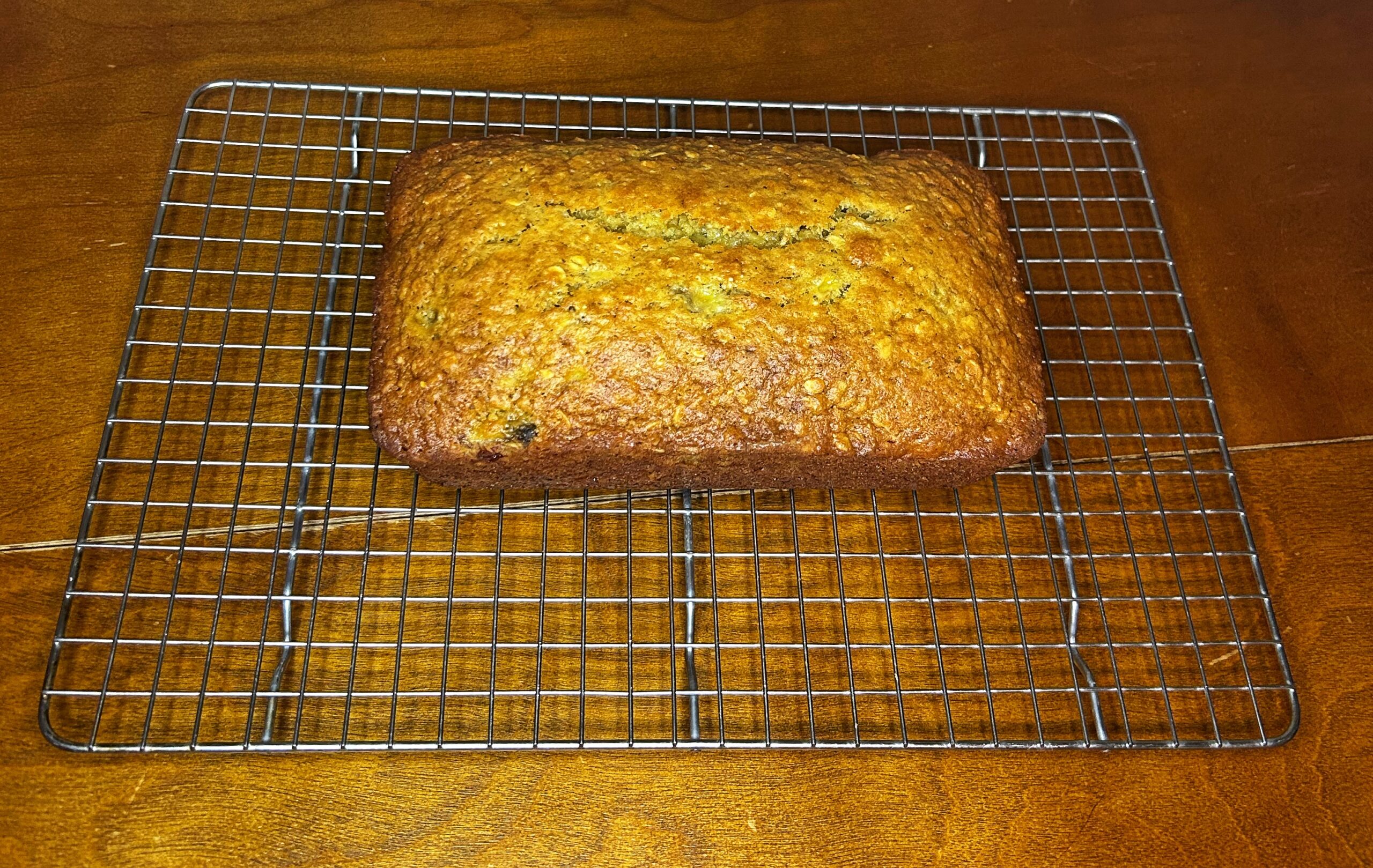 4. Spoon batter into a greased 8x4 or 9x5-inch loaf pan. Bake at 350 degrees for 55 minutes or until a wooded toothpick inserted into the middle comes out clean.
