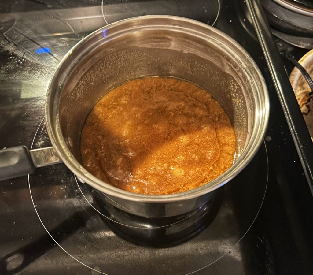 Step 6: In a medium sauce pan over medium heat, bring butter and brown sugar to a soft, rolling boil and cook for 5-7 minutes. Remove from the heat and let stand for 5 minutes.