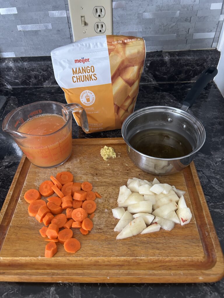 Step 2: Combine brewed tea, ginger, mangoes, carrots, and pear in a blender; process until smooth.