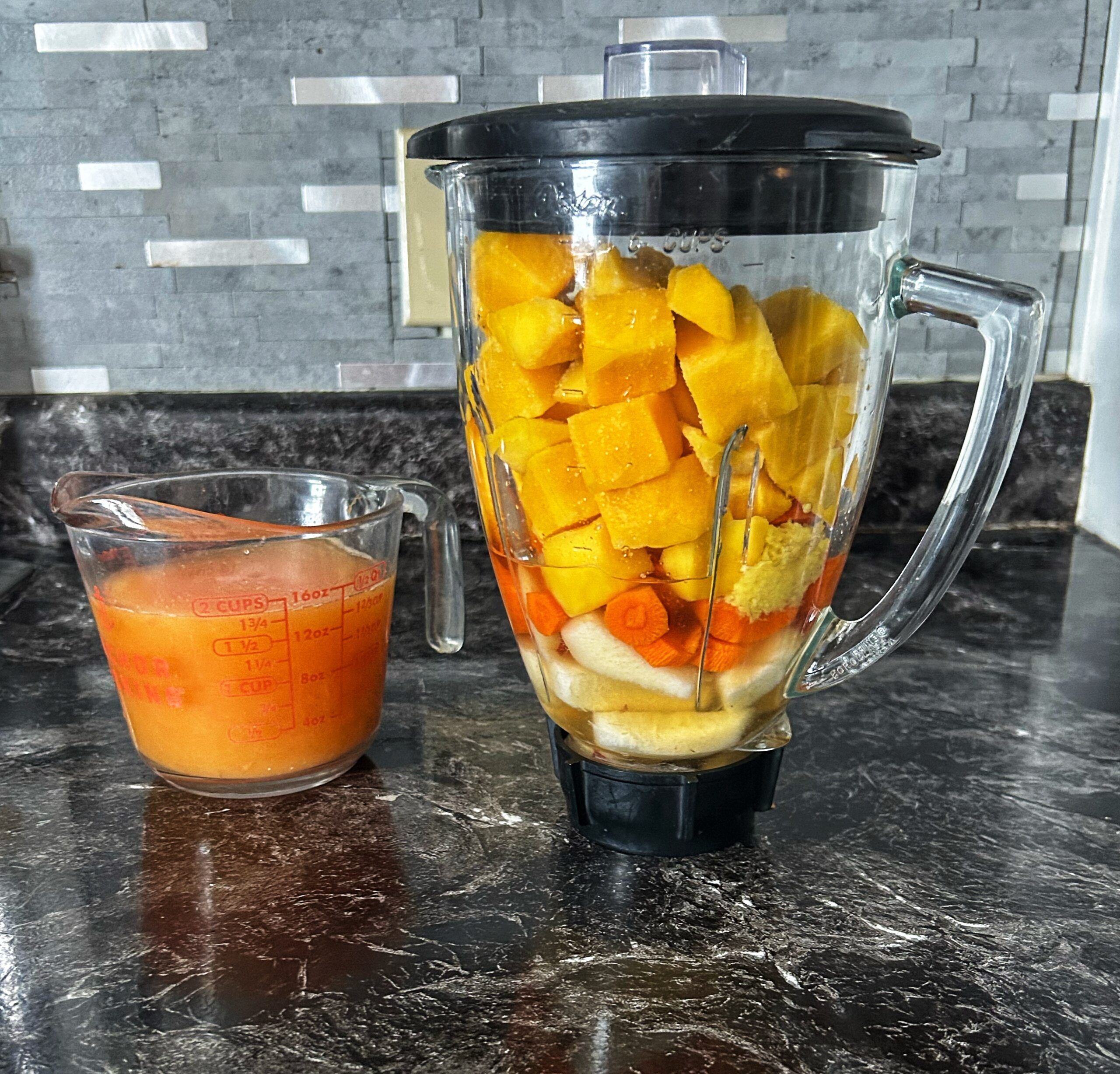 Step 2: Combine brewed tea, ginger, mangoes, carrots, and pear in a blender; process until smooth.