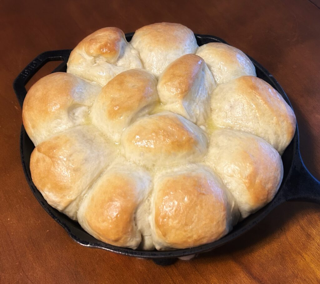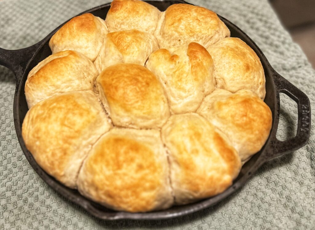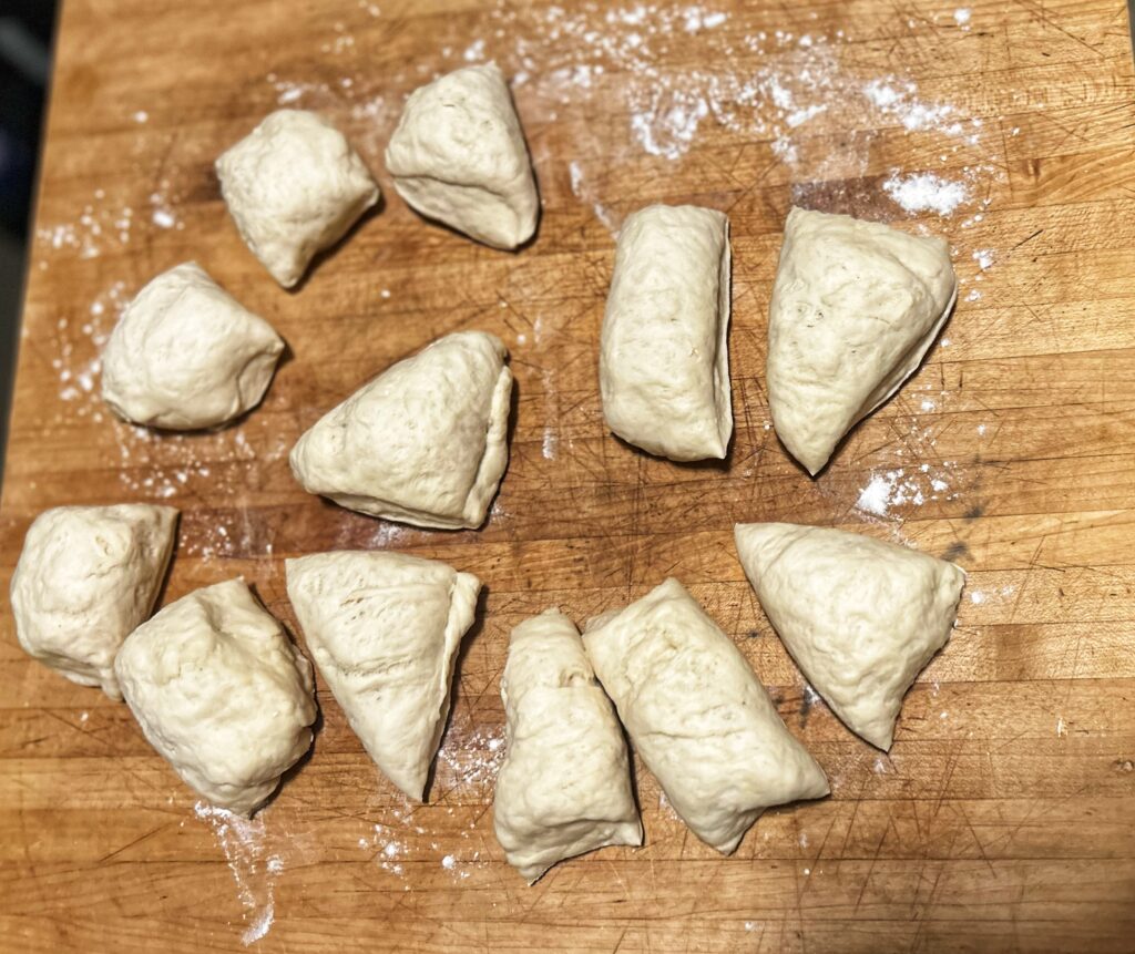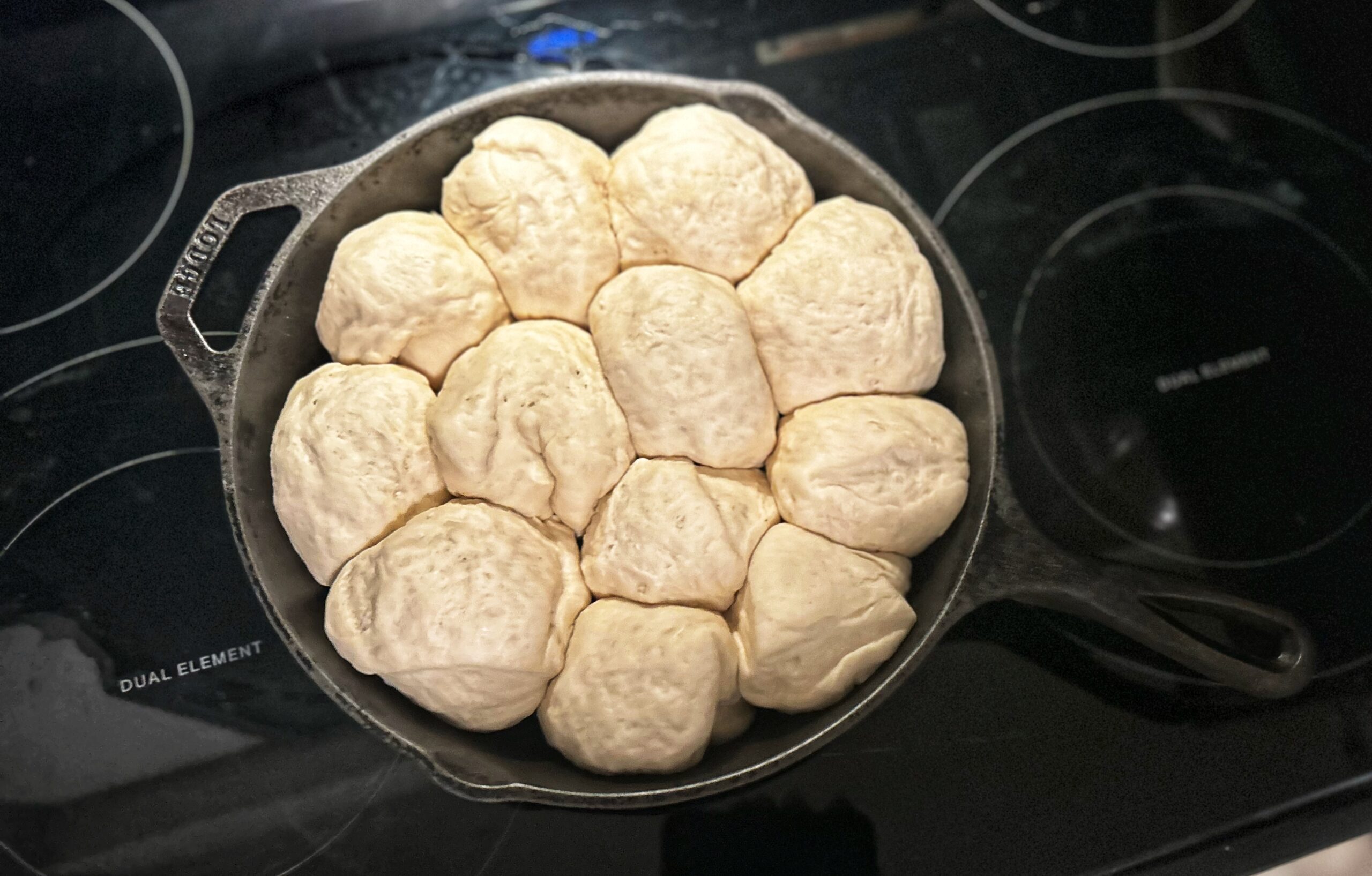 Turn dough out onto a lightly floured surface. Press to remove air pockets. Using a bench scraper or knife, divide the dough into 12 equal pieces. Roll each piece into a ball and place in a well seasoned cast iron skillet or a greased 9x13 pan.