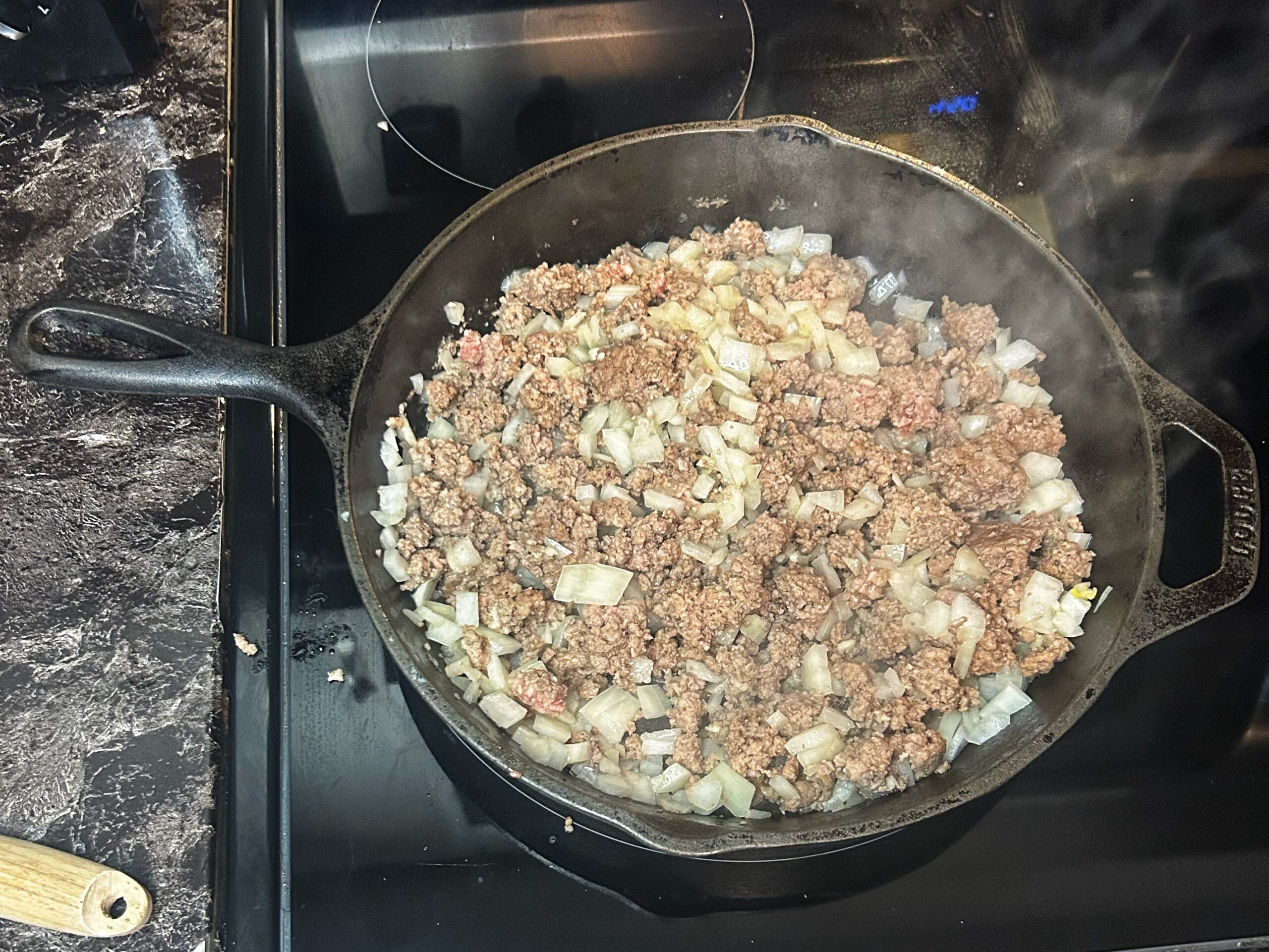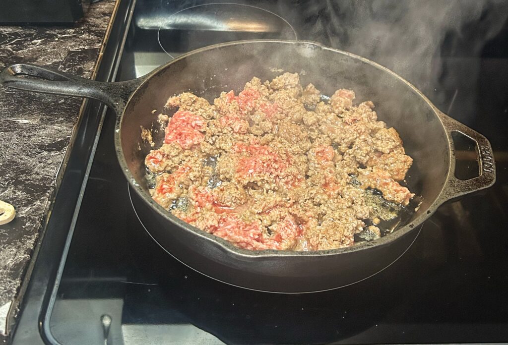 Step 1: Cook and stir ground beef, onion and garlic in a pan over medium-high heat until beef is browned, stirring to break up meat. Drain fat if necessary.